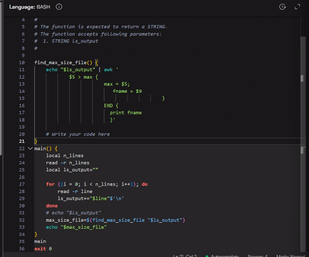 Complete the function find_max_size_file in the editor with the following parameters: string ls_output: a multi-line string containing the output of the Linux ls -l command