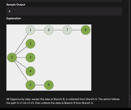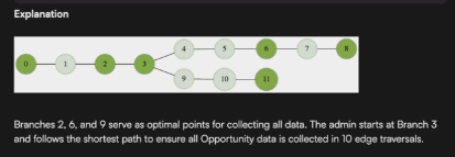 To gather all Opportunity data, the admin must navigate through the branches using bidirectional paths (edges), which can be traversed multiple times if necessary. The goal is to minimize the total distance traveled, measured by the number of edges crossed. Additionally, any data within a radius of 2 edges from a branch can be collected. For system consistency, the retrieval process must start and end at the same branch.
